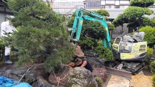 松の搬入が一苦労しました。門があってそこに松を通すのが大変でした。バックホウという機械を使いうまく搬入します。木の向きや、植える深さに注意しながら松を土の中におさめます。