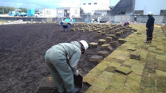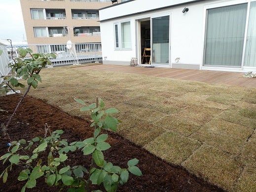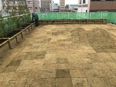 樹皮土壌 を使用した芝生の屋上緑化。超軽量土壌です。